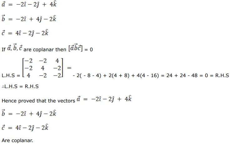 If $\overrightarrow{\mathrm{a}}=(-2 \hat{\mathrm{i}}-2 \hat{\mathrm{j}}+4 \hat{\mathrm{k}}), \overrightarrow{\mathrm{b}}=(-2 \hat{\mathrm{j}}+4 \hat{\mathrm{j}}-2 \hat{\mathrm{k}})$ and $\overrightarrow{\mathrm{c}}=(4 \hat{\mathrm{i}}-2 \hat{\mathrm{j}}-2 \hat{\mathrm{k}})$ then prove that $\overrightarrow{\mathrm{a}}, \overrightarrow{\mathrm{b}}$ and $\vec{C}$ are coplanar.