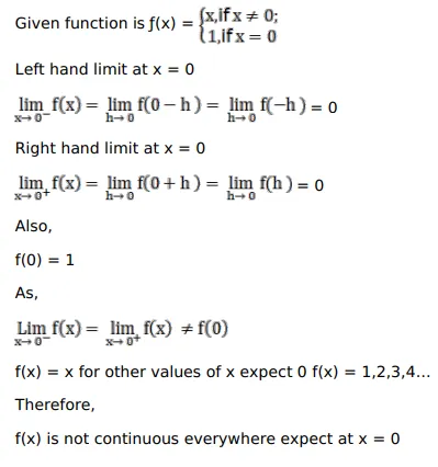 Show that $f(x)=\left\{\begin{array}{ll}x, & \text { if } x \neq 0 ; \\ 1, & \text { if } x=0\end{array}\right.$ is continuous at each point except $0 .$