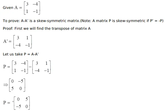 Question: If $\mathrm{A}=\left[\begin{array}{ll}3 & -4 \\ 1 & -1\end{array}\right]$, show that $\left(\mathrm{A}+\mathrm{A}^{\prime}\right)$ is skew-symmetric.