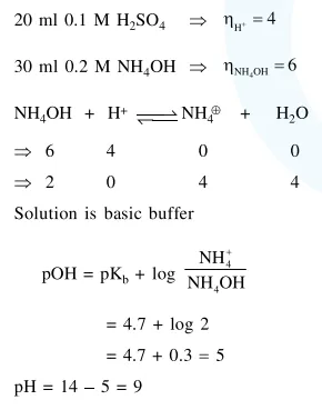 $20 \mathrm{~mL}$ of $0.1 \mathrm{MH}_{2} \mathrm{SO}_{4}$ solution is added to 30 $\mathrm{mL}$ of $0.2 \mathrm{M} \mathrm{NH}_{4} \mathrm{OH}$ solution. The $\mathrm{pH}$ of the resulatant mixture is : $\left[\mathrm{pk}_{\mathrm{b}}\right.$ of $\left.\mathrm{NH}_{4} \mathrm{OH}=4.7\right]$.