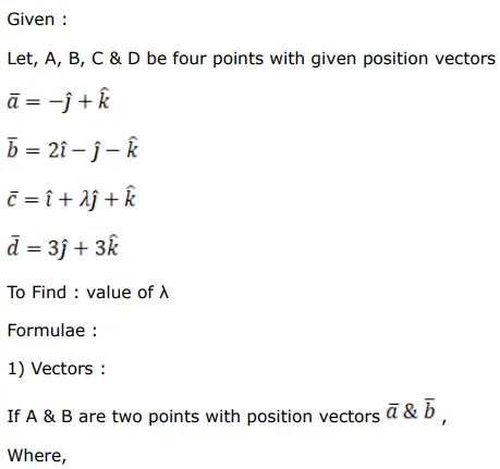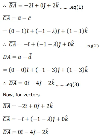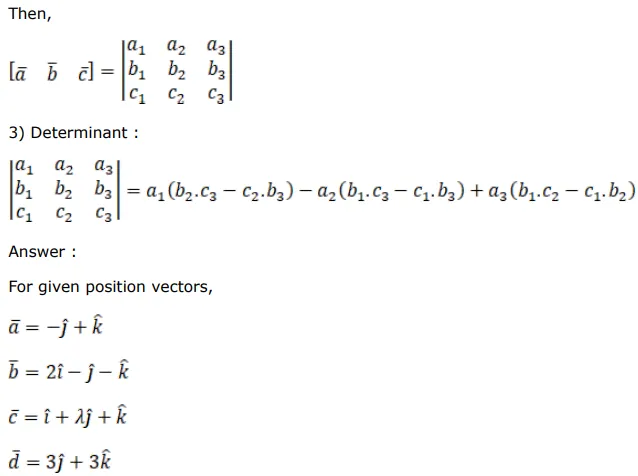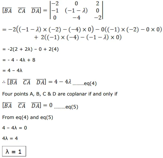 Find the value of $\lambda$ for which the four points with position vectors $(-\hat{\mathrm{j}}+\hat{\mathrm{k}})$ $(2 \hat{\mathrm{i}}-\hat{\mathrm{j}}-\hat{\mathrm{k}}),(\hat{\mathrm{i}}+\lambda \hat{\mathrm{j}}+\hat{\mathrm{k}})$ and $(3 \hat{\mathrm{j}}+3 \hat{\mathrm{k}})$ are coplanar.