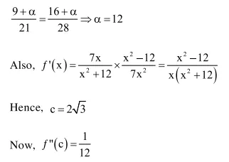 If $\mathrm{c}$ is a point at which Rolle's theorem holds for the function, $f(\mathrm{x})=\log _{\mathrm{e}}\left(\frac{\mathrm{x}^{2}+\alpha}{7 \mathrm{x}}\right)$ in the interval $[3,4]$, where $\alpha \in \mathrm{R}$, then $f^{\prime \prime}(\mathrm{c})$ is equal to