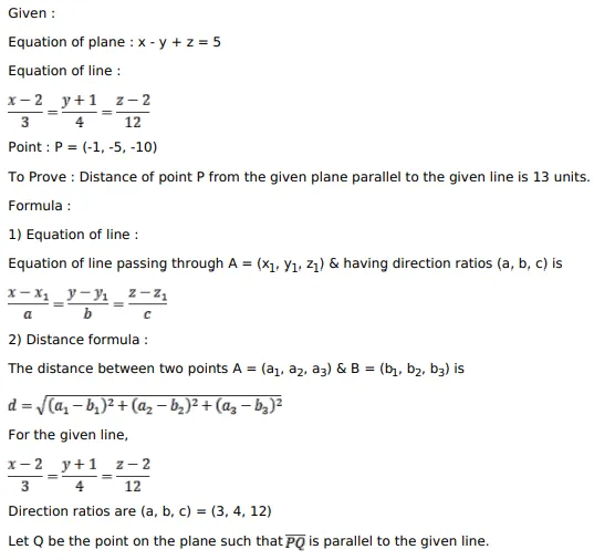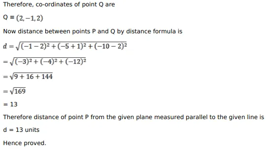 Show that the distance of the point of intersection of the line $\frac{x-2}{3}=\frac{y+1}{4}=\frac{z-2}{12}$ and the plane $x-y+z=5$ from the point $(-1,-5-10)$ is 13 units.