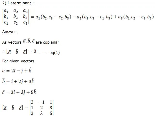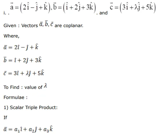 i. $\overrightarrow{\mathrm{a}}=(2 \hat{\mathrm{i}}-\hat{\mathrm{j}}+\hat{\mathrm{k}}), \overrightarrow{\mathrm{b}}=(\hat{\mathrm{i}}+2 \hat{\mathrm{j}}+3 \hat{\mathrm{k}})$ and $\overrightarrow{\mathrm{c}}=(3 \hat{\mathrm{i}}+\lambda \hat{\mathrm{j}}+5 \hat{\mathrm{k}})$