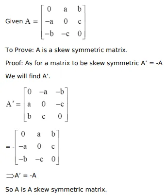 Show that the matrix $A=\left[\begin{array}{ccc}0 & \mathrm{a} & \mathrm{b} \\ -\mathrm{a} & 0 & \mathrm{c} \\ -\mathrm{b} & -\mathrm{c} & 0\end{array}\right]$ is skew-symmetric.