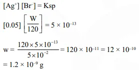 Solubility product of silver bromide is $5.0 \times 10^{-13}$. The quantity of potassium bromide (molar mass taken as $120 \mathrm{~g} \mathrm{~mol}^{-1}$ ) to be added to 1 litre of $0.05 \mathrm{M}$ solution of silver nitrate to start the precipitation of AgBr is :-