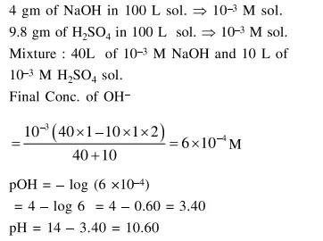 Two solutions $\mathrm{A}$ and $\mathrm{B}$, each of $100 \mathrm{~L}$ was made by dissolving $4 \mathrm{~g}$ of $\mathrm{NaOH}$ and $9.8 \mathrm{~g}$ of $\mathrm{H}_{2} \mathrm{SO}_{4}$ in water, respectively. The $\mathrm{pH}$ of the resultant solution obtained from mixing $40 \mathrm{~L}$ of solution $\mathrm{A}$ and $10 \mathrm{~L}$ of solution B is