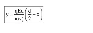 $\mathrm{y}=\frac{-\mathrm{qEdx}}{\mathrm{mv}_{0}^{2}}-\frac{1}{2} \frac{\mathrm{qEd}^{2}}{\mathrm{mv}_{0}^{2}}+\frac{\mathrm{qEd}^{2}}{\mathrm{mv}_{0}^{2}}$