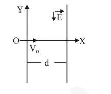 $\mathrm{y}_{0}=\frac{1}{2} \cdot \frac{\mathrm{qE}}{\mathrm{m}}\left(\frac{\mathrm{d}}{\mathrm{v}_{0}}\right)^{2}=\frac{1}{2} \frac{\mathrm{qEd}^{2}}{\mathrm{mv}_{0}^{2}}$