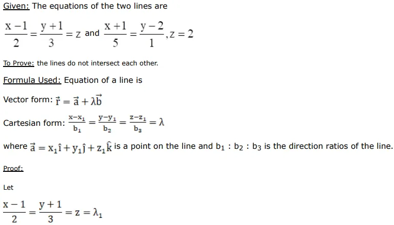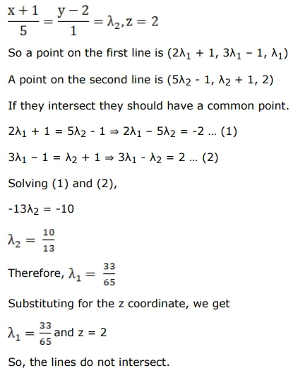 Show that the lines $\frac{x-1}{2}=\frac{y+1}{3}=z$ and $\frac{x+1}{5}=\frac{y-2}{1}, z=2$ do not intersect each other.