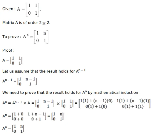 If $\mathrm{A}=\left[\begin{array}{ll}1 & 1 \\ 0 & 1\end{array}\right]$, prove that $\mathrm{A}^{\mathrm{n}}=\left[\begin{array}{ll}1 & \mathrm{n} \\ 0 & 1\end{array}\right]$ for all $\mathrm{n} \in \mathrm{N}$