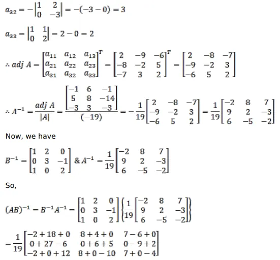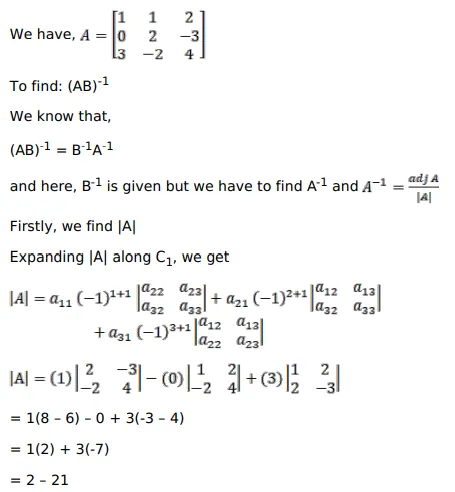 Compute $(\mathrm{AB})^{-1}$ when $\mathrm{A}=\left[\begin{array}{ccc}1 & 1 & 2 \\ 0 & 2 & -3 \\ 3 & -2 & 4\end{array}\right]$ and $\mathrm{B}^{-1}=\left[\begin{array}{ccc}1 & 2 & 0 \\ 0 & 3 & -1 \\ 1 & 0 & 2\end{array}\right]$