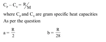 $\mathrm{C}_{\mathrm{p}}$ and $\mathrm{C}_{\mathrm{v}}$ are specific heats at constant pressure and constant volume respectively. It is observed that $C_{p}-C_{v}=a$ for hydrogen gas $C_{p}-C_{v}=b$ for nitrogen gas The correct relation between a and $b$ is :