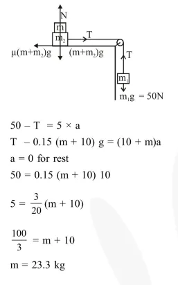 Two masses $\mathrm{m}_{1}=5 \mathrm{~kg}$ and $\mathrm{m}_{2}=10 \mathrm{~kg}$, connected by an inextensible string over a frictionless pulley, are moving as shown in the figure. The coefficient of friction of horizontal surface is $0.15$. The minimum weight $m$ that should be put on top of $m_{2}$ to stop the motion is :-
