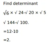 Evaluate $\left|\begin{array}{cc}\sqrt{6} & \sqrt{5} \\ \sqrt{20} & \sqrt{24}\end{array}\right|$