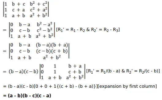 $\left|\begin{array}{lll}1 & b+c & b^{2}+c^{2} \\ 1 & c+a & c^{2}+a^{2} \\ 1 & a+b & a^{2}+b^{2}\end{array}\right|=(a-b)(b-c)(c-a)$