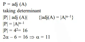 If $P=\left[\begin{array}{lll}1 & \alpha & 3 \\ 1 & 3 & 3 \\ 2 & 4 & 4\end{array}\right]$ is the adjoint of a $3 \times 3$ matrix $A$ and $|A|=4$, then $\alpha$ is equal to