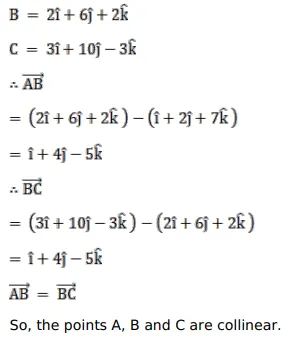 Show that the points $A, B$ and $C$ having position vectors $(\hat{i}+2 \hat{j}+7 \hat{k}),(2 \hat{i}+6 \hat{j}+3 \hat{k})$ and $(3 \hat{i}+10 \hat{j}-3 \hat{k})$ respectively, are collinear.