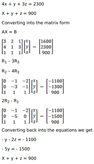 $\left.\begin{array}{l}3 x+2 y+z=1600 \\ 4 x+y+3 z=2300 \\ x+y+z=900\end{array}\right\}$