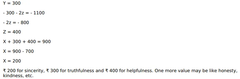 Two schools $A$ and $B$ want to award their selected students on the values of sincerity, truthfulness and helpfulness. The school $A$ wants to award $₹ x$ each, ₹ $y$ each and $₹$ each for the three respective values to 3,2 and 1 students respectively with total award money of ₹ 1,600 . School $B$ wants to spend $₹ 2,300$ to award its 4,1 and 3 students on the respective values (by giving the same award money to the three values as before). If the total amount of award for one prize on each value is $₹ 900$, using matrices, find the award money for each value. Apart from these three values, suggest one more value which should be considered for award.