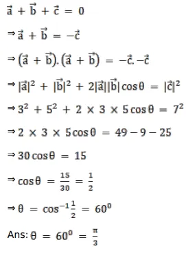 If $\vec{a}+\vec{b}+\vec{c}=\overrightarrow{0},|\vec{a}|=3,|\vec{b}|=5$ and $|\vec{c}|=7$, find the angle between $\vec{a}$ and $\vec{b}$.