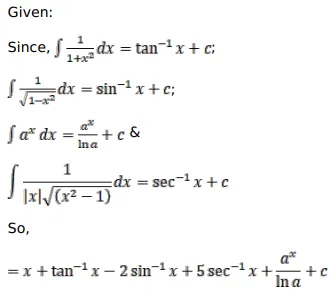 $\int\left[1+\frac{1}{\left(1+x^{2}\right)}-\frac{2}{\sqrt{1-x^{2}}}+\frac{5}{x \sqrt{x^{2}-1}}+a^{x}\right] d x$