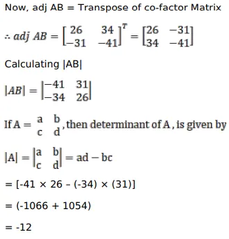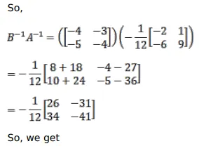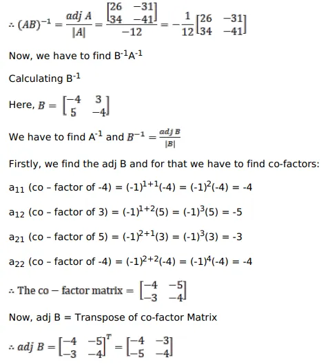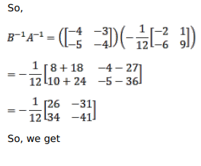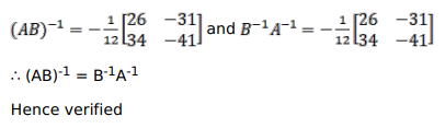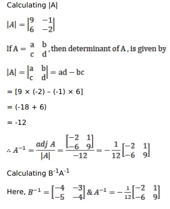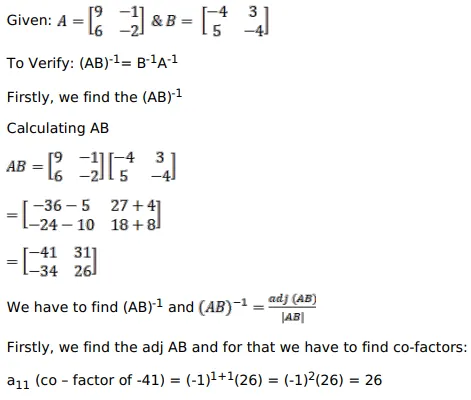 If $A=\left[\begin{array}{cc}9 & -1 \\ 6 & -2\end{array}\right]$ and $B=\left[\begin{array}{cc}-4 & 3 \\ 5 & -4\end{array}\right]$, verify that $(A B)^{-1}=B^{-1} A^{-1}$