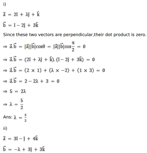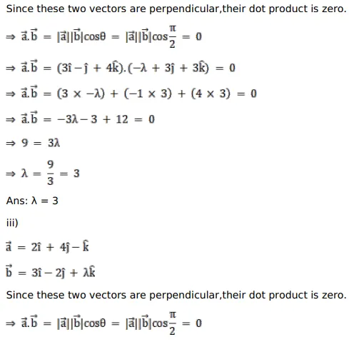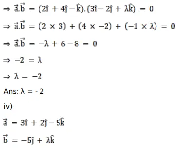 iii. $\overrightarrow{\mathrm{a}}=2 \hat{\mathrm{i}}+4 \hat{\mathrm{j}}-\hat{\mathrm{k}}$ and $\overrightarrow{\mathrm{b}}=3 \hat{\mathrm{i}}-2 \hat{\mathrm{j}}+\lambda \hat{\mathrm{k}}$