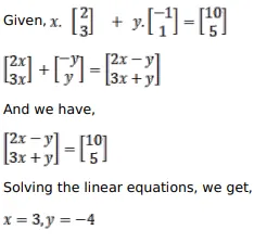 If $x .\left[\begin{array}{l}2 \\ 3\end{array}\right]+y .\left[\begin{array}{c}-1 \\ 1\end{array}\right]=\left[\begin{array}{r}10 \\ 5\end{array}\right]$, find the values of $x$ and $y$.