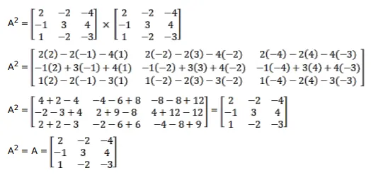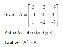 If $\mathrm{A}=\left[\begin{array}{ccc}2 & -2 & -4 \\ -1 & 3 & 4 \\ 1 & -2 & -3\end{array}\right]$, show that $A^{2}=A$