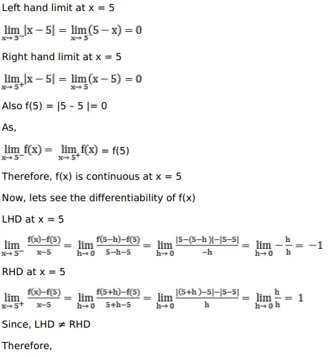 Show that $f(x)=|x-5|$ is continuous but not differentiable at $x=5$