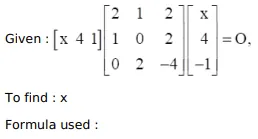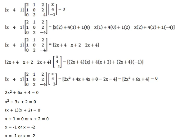 If $\left[\begin{array}{lll}x & 4 & 1\end{array}\right]\left[\begin{array}{ccc}2 & 1 & 2 \\ 1 & 0 & 2 \\ 0 & 2 & -4\end{array}\right]\left[\begin{array}{r}x \\ 4 \\ -1\end{array}\right]=O$, find $x$