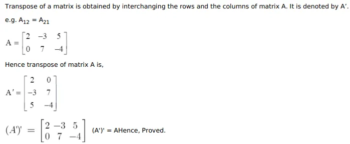 If $A=\left[\begin{array}{ccc}2 & -3 & 5 \\ 0 & 7 & -4\end{array}\right]$, verify that $\left(A^{\prime}\right)^{\prime}=A$.