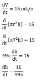Oil is leaking at the rate of $15 \mathrm{~mL} / \mathrm{s}$ from a vertically kept cylindrical drum containing oil. If the radius of the drum is $7 \mathrm{~cm}$ and its height is $60 \mathrm{~cm}$, find the rate at which the level of the oil is changing when the oil level is $18 \mathrm{~cm}$.