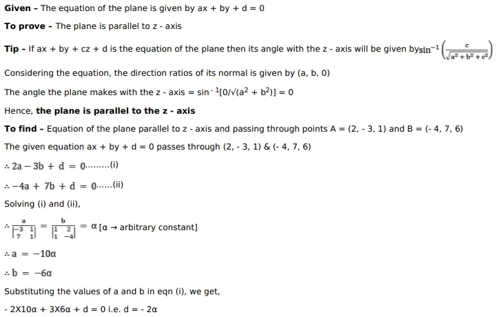 Show that the equation $a x+b y+d=0$ represents a plane parallel to the $z$ - axis. Hence, find the equation of a plane which is parallel to the $z$ - axis and passes through the points $A(2,-3,1)$ and $B(-4,7,6)$.