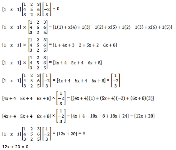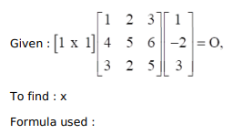 If $\left[\begin{array}{lll}1 & \mathrm{x} & 1\end{array}\right]\left[\begin{array}{ccc}1 & 2 & 3 \\ 4 & 5 & 6 \\ 3 & 2 & 5\end{array}\right]\left[\begin{array}{c}1 \\ -2 \\ 3\end{array}\right]=\mathrm{O}$, find $\mathrm{x}$