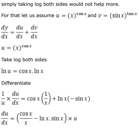 If $y=(x)^{\cos x}+(\sin x)^{\tan x}$, prove that $\frac{d y}{d x}=x^{\cos x}\left\{\frac{\cos x}{x}-(\sin x) \log x\right\}+(\sin x)^{\tan x}$
