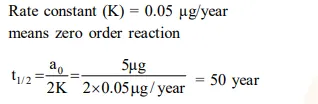 Decomposition of $X$ exhibits a rate constant of $0.05$ $\mu \mathrm{g} /$ year. How many years are required for the decomposition of $5 \mu \mathrm{g}$ of $\mathrm{X}$ into $2.5 \mu \mathrm{g}$ ?