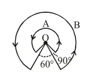 A wire A, bent in the shape of an arc of a circle, carrying a current of $2 \mathrm{~A}$ and having radius $2 \mathrm{~cm}$ and another wire B, also bent in the shape of arc of a circle, carrying a current of $3 \mathrm{~A}$ and having radius of $4 \mathrm{~cm}$, are placed as shown in the figure. The ratio of the magnetic fields due to the wires $\mathrm{A}$ and $\mathrm{B}$ at the common centre $\mathrm{O}$ is :