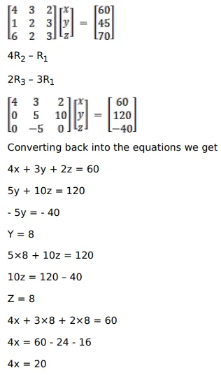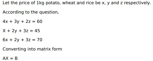 The cost of $4 \mathrm{~kg}$ potato, $3 \mathrm{~kg}$ wheat and $2 \mathrm{~kg}$ of rice is ₹ 60 . The cost of $1 \mathrm{~kg}$ potato, $2 \mathrm{~kg}$ wheat and $3 \mathrm{~kg}$ of rice is ₹ 45 . The cost of $6 \mathrm{~kg}$ potato, $2 \mathrm{~kg}$ wheat and $3 \mathrm{~kg}$ of rice is ₹ 70 . Find the cost of each item per $\mathrm{kg}$ by matrix method.