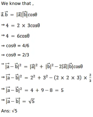 If $|\vec{a}|=2,|\vec{b}|=3$ and $\vec{a} \cdot \vec{b}=4$, find $|\vec{a}-\vec{b}|$.