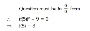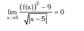 Question: Let $f: \mathrm{R} \rightarrow[0, \infty)$ be such that $\lim _{x \rightarrow 5} f(x)$ exists and $\lim _{x \rightarrow 5} \frac{(f(x))^{2}-9}{\sqrt{|x-5|}}=0$. Then $\operatorname{Lim}_{x \rightarrow 5} f(x)$