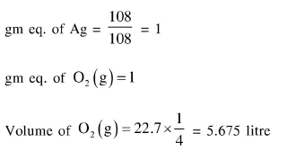 $108 \mathrm{~g}$ of silver (molar mass $108 \mathrm{~g} \mathrm{~mol}^{-1}$ ) is deposited at cathode from $\mathrm{AgNO}_{3}(\mathrm{aq})$ solution by a certain quantity of electricity. The volume (in L) of oxygen gas produced at $273 \mathrm{~K}$ and 1 bar pressure from water by the same quantity of electricity is