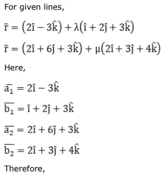 Show that the lines $\overrightarrow{\mathrm{r}}=(2 \hat{\mathrm{i}}-3 \hat{\mathrm{k}})+\lambda(\hat{\mathrm{i}}+2 \mathrm{j}+3 \hat{\mathrm{k}})$ and $\overrightarrow{\mathrm{r}}=(2 \hat{\mathrm{i}}+6 \hat{\mathrm{j}}+3 \hat{\mathrm{k}})+\mu$ $(2 \hat{\mathrm{i}}+3 \hat{\mathrm{j}}+4 \hat{\mathrm{k}})$ intersect.