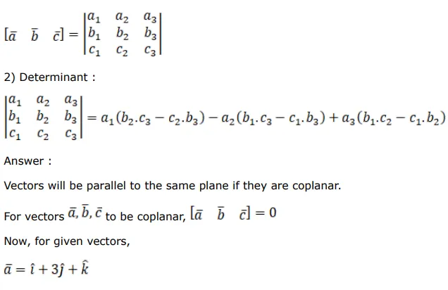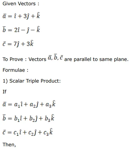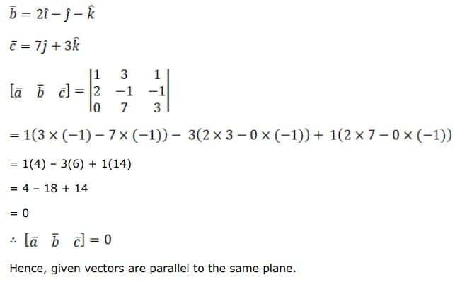 Show that the vectors $\overrightarrow{\mathrm{a}}=(\hat{\mathrm{i}}+3 \hat{\mathrm{j}}+\hat{\mathrm{k}}), \overrightarrow{\mathrm{b}}=(2 \hat{\mathrm{i}}-\hat{\mathrm{j}}-\hat{\mathrm{k}})$ and $\overrightarrow{\mathrm{c}}=(7 \hat{\mathrm{j}}+3 \hat{\mathrm{k}})$ are parallel to the same plane.