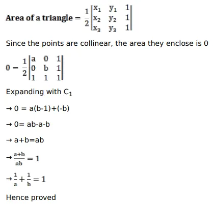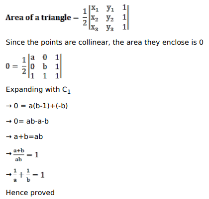 If the points $\mathrm{A}(\mathrm{a}, 0), \mathrm{B}(0, \mathrm{~b})$ and $\mathrm{C}(1,1)$ are collinear, prove that $\frac{1}{\mathrm{a}}+\frac{1}{\mathrm{~b}}=1$.