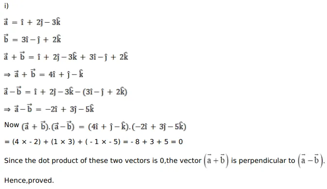 i. If $\overrightarrow{\mathrm{a}}=\hat{\mathrm{i}}+2 \hat{\mathrm{j}}-3 \hat{\mathrm{k}}$ and $\overrightarrow{\mathrm{b}}=3 \hat{\mathrm{i}}-\hat{\mathrm{j}}+2 \hat{\mathrm{k}}$, show that $(\overrightarrow{\mathrm{a}}+\overrightarrow{\mathrm{b}})$ is perpendicular to $(\overrightarrow{\mathrm{a}}-\overrightarrow{\mathrm{b}})$.