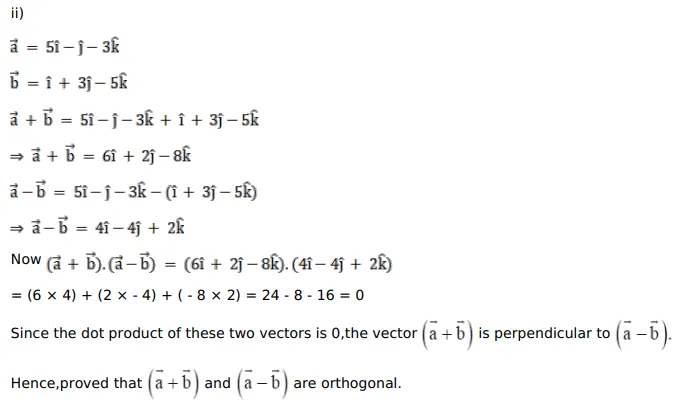 ii. If $\overrightarrow{\mathrm{a}}=(5 \hat{\mathrm{i}}-\hat{\mathrm{j}}-3 \hat{\mathrm{k}})$ and $\overrightarrow{\mathrm{b}}=(\hat{\mathrm{i}}+3 \hat{\mathrm{j}}-5 \hat{\mathrm{k}})$ then show that $(\overrightarrow{\mathrm{a}}+\overrightarrow{\mathrm{b}})$ and $(\overrightarrow{\mathrm{a}}-\overrightarrow{\mathrm{b}})$ are orthogonal.