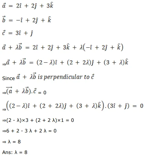 If $\vec{a}=(2 \hat{i}+2 \hat{j}+3 \hat{k}), \vec{b}=(-\hat{i}+2 \hat{j}+\hat{k})$ and $\overrightarrow{\mathrm{c}}=(3 \hat{\mathrm{i}}+\hat{\mathrm{j}})$ are such that $(\vec{a}+\lambda \vec{b})$ is perpendicular to $\vec{C}$ then find the value of $\lambda$.