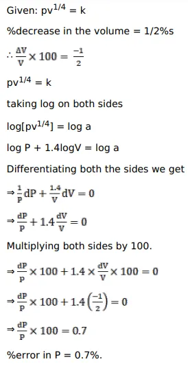 The pressure $\mathrm{p}$ and the volume $\mathrm{V}$ of a gas are connected by the relation, $\mathrm{p} \mathrm{V}^{1 / 4}=\mathrm{k}$, where $\mathrm{k}$ is a constant. Find the percentage increase in the pressure, corresponding to a diminution of $0.5 \%$ in the volume.